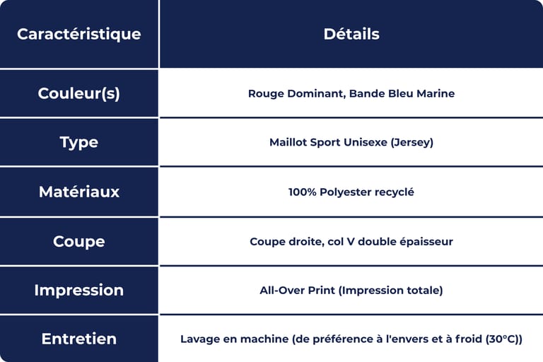 Performance et Éco-responsabilité : Ce maillot est conçu dans un tissu sport recyclé [Ex. Polyester recyclé] qui évacue l'humidité et sèche rapidement. Il est aussi léger qu'une plume, parfait pour l'effort intense ou pour les chaudes journées d'été.