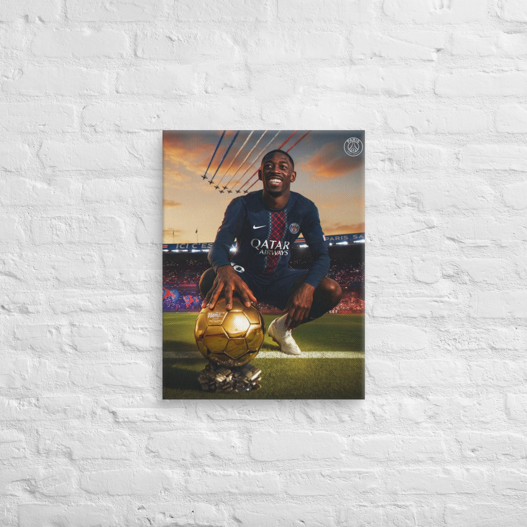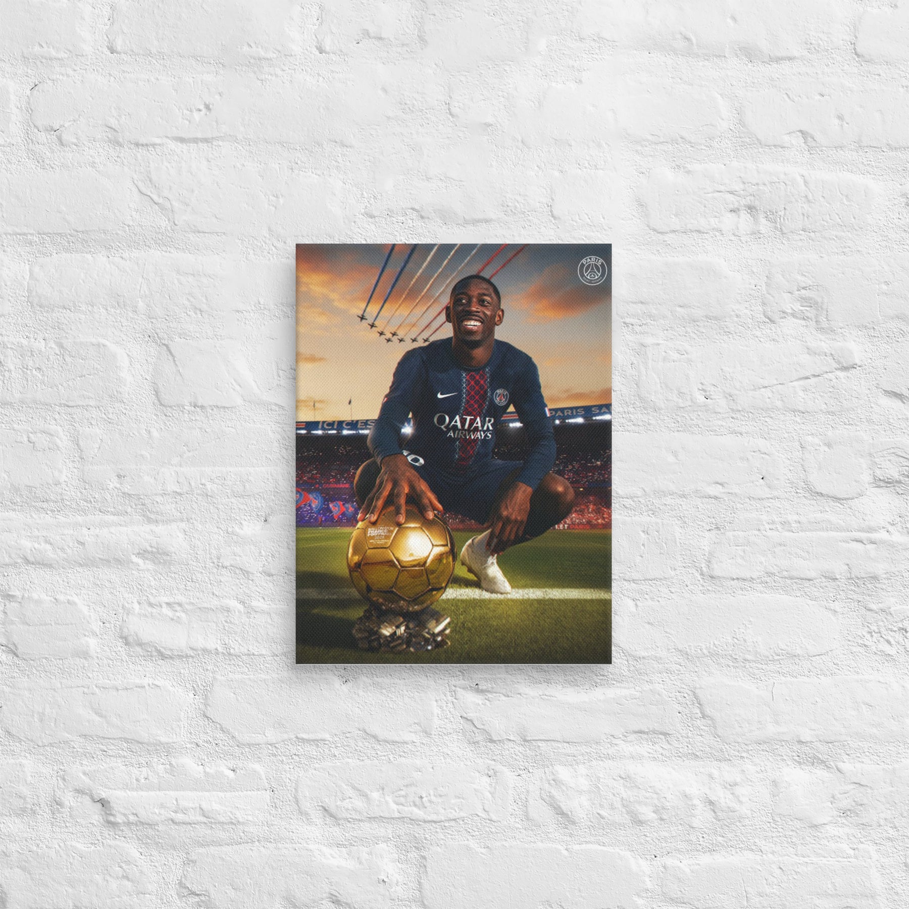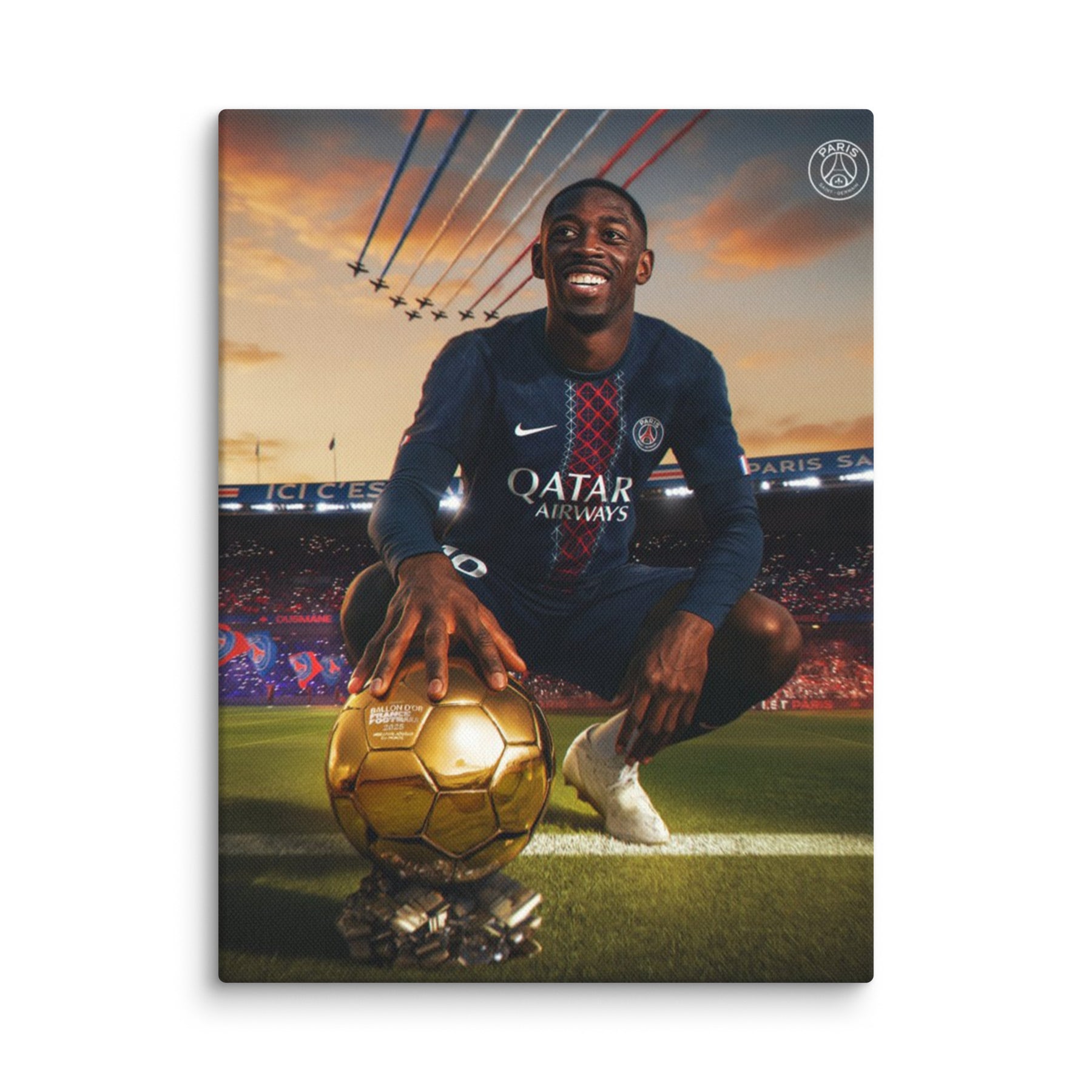 L'hommage ultime à la ferveur populaire. Cette toile épique immortalise Ousmane Dembélé, sourire éclatant et main sur le trophée doré, sous l'hymne désormais culte des tribunes : "Et Ousman Ballon d'Or". Un mélange saisissant de passion, d'ambition et de grandeur nationale pour transformer votre mur en véritable sanctuaire.