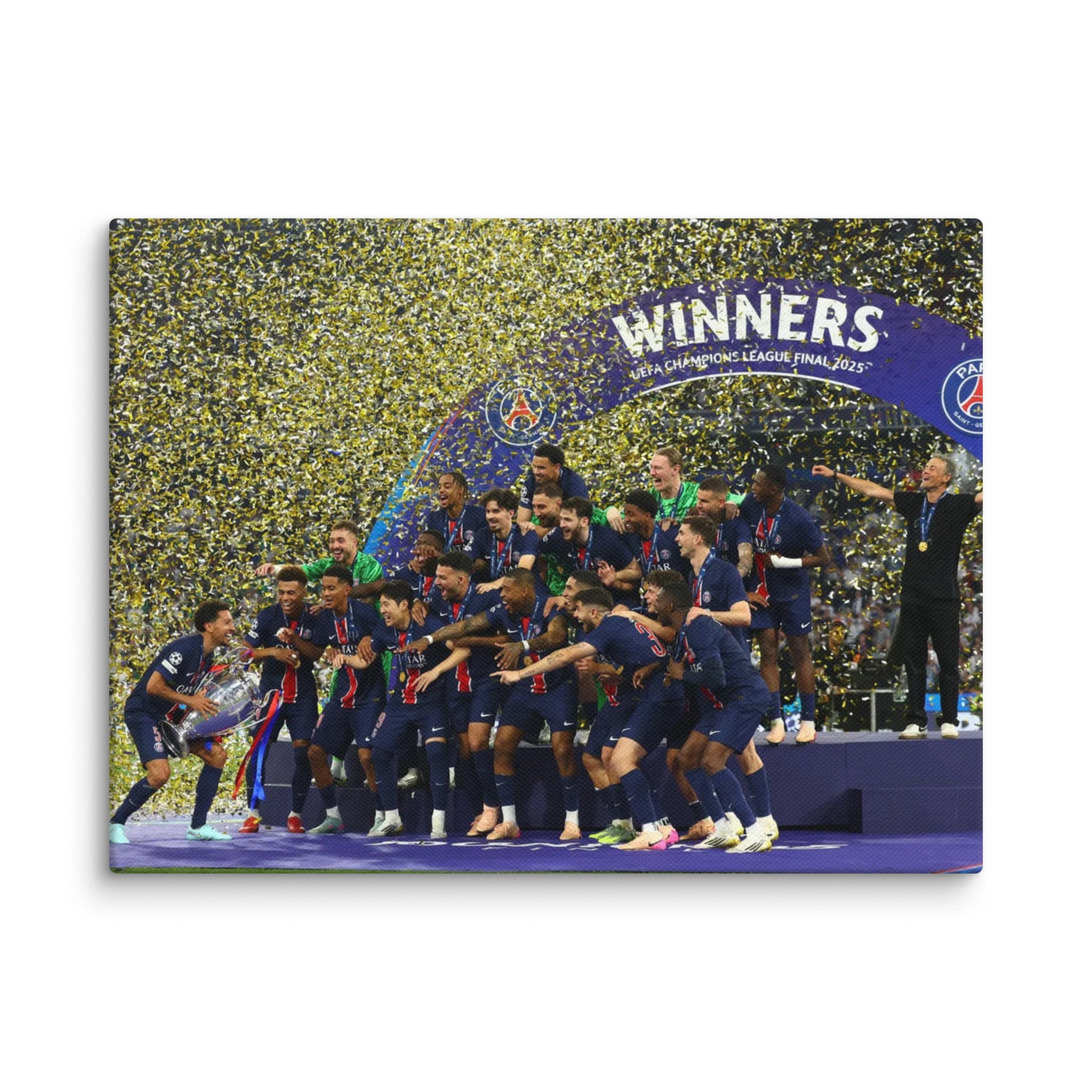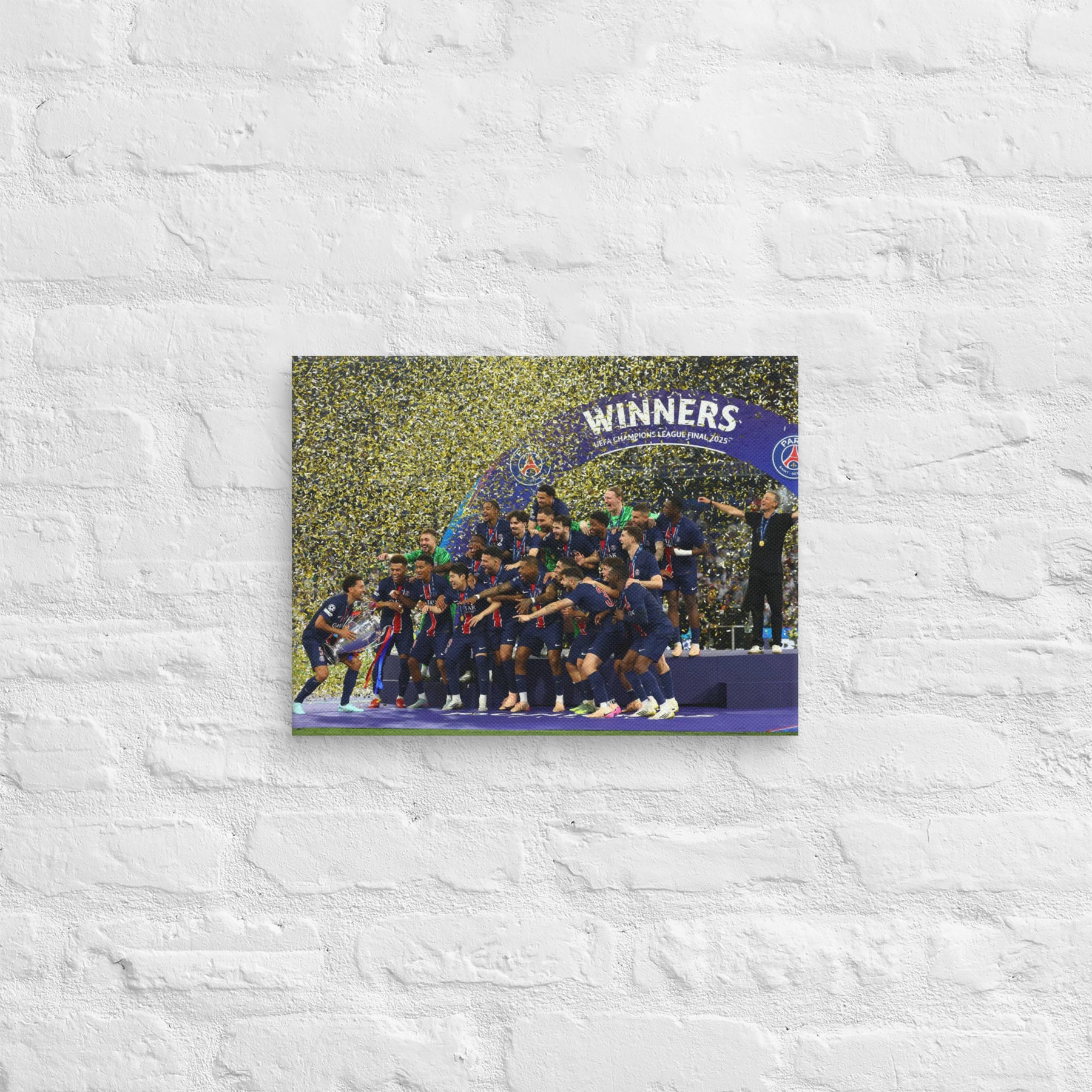 Le sommet de l'histoire. Cette toile dynamique capture l'instant ultime où le rêve devient réalité : l'équipe unie sous une pluie de confettis dorés, le trophée brandi vers le ciel et le slogan "WINNERS" trônant au-dessus de la scène. Une œuvre d'art chargée d'adrénaline pour transformer votre intérieur en temple de la victoire.
